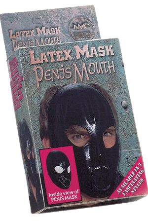 Maschera in lattice nero con un mini pene interno per la bocca.