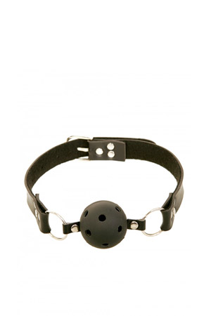 Morso con pallina in plastica con fori. La cinghia è realizzata in robusta pelle nera con fibbie in metallo.
