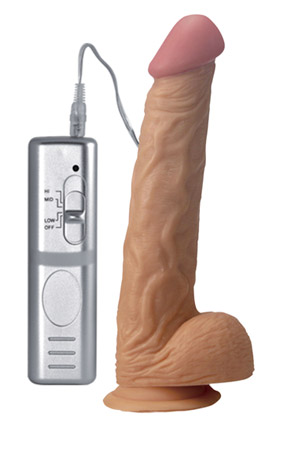 Fallo realistico dalle dimensioni importanti. Il suo diametro di ben 5 cm e la sua lunghezza di oltre 24 cm, di cui 20 inseribili, fanno di questo articolo il prodotto adatto per chi vuole provare qualcosa di grosso. Le sue forme, il glande ben scolpito, le venature lungo il tronco e i testicoli, lo rendono particolarmente realistico. Inoltre è dotato di vibrazione a tre velocità e di una potente ventosa per poterlo utilizzare senza mani.