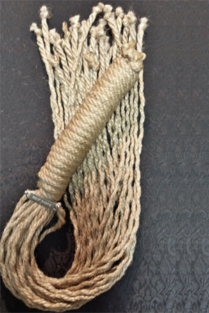 Code con nodi finali. Corda grezza. Lunghezza Manico: 15cm. Lunghezza Totale: 70cm. Made in Italy. Raffinata a fuoco. Materiale: Juta.