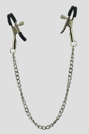 Pinze per capezzoli con stretta regolabile, interamente realizzate in metallo sono unite da una catenella a maglia fina lunga 30cm.