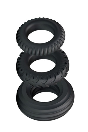 Anelli fallici a forma di ruota da fuoristrada. Ognuno con un battistrada diverso ma tutti e tre con lo stesso diametro interno e la stessa capacità di adattarsi ad ogni pene grazie all`alta elasticità. La funzione dell`anello è quella di ritardare l`eiaculazione e di mantenere l`erezione il più a lungo possibile impedendo al sangue di defluire dal pene.