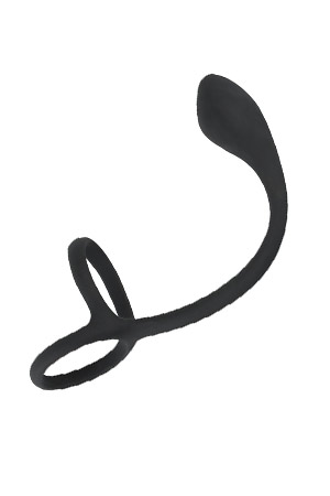 Anello fallico con plug anale. Doppio anello per testicoli e pene con agganciato un plug anale L`anello svolge la funzione costrittiva per ritardare l`eiaculazione e mantenere l`erezione, il plug può essere inserito nel proprio ano per la stimolazione della prostata. Come variante è possibile inserire il plug nell`ano della partner per una doppia penetrazione. L`anello elastico permette di adattarsi ad ogni pene.