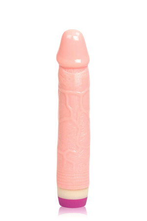 Vibratore realistico con glande scolpito e venature lungo il corpo.