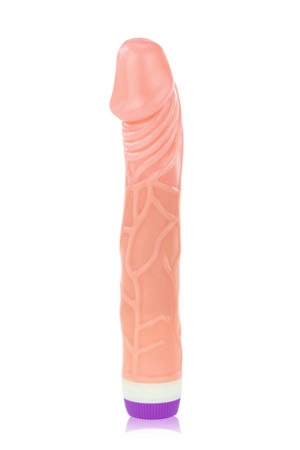 Vibratore realistico con glande scolpito e venature lungo il corpo.
